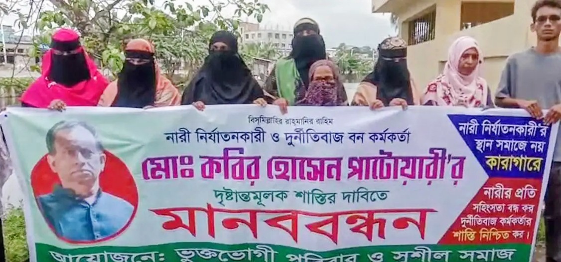 বহু বিবাহ ও নারী নির্যাতনের প্রতিবাদে বরিশাল বন বিভাগের উপবন সংরক্ষক মো. কবির হোসেন পাটোয়ারী বিরুদ্ধে মানববন্ধন করেছেন ভুক্তভোগী পরিবার। মানবন্ধনে থাকা স্ত্রীদের অভিযোগ ওই কর্মকর্তার ১৬ থেকে ১৭ জন স্ত্রী রয়েছে।