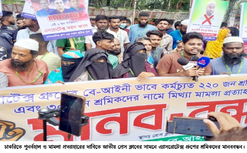 চাকরিতে পুনর্বহাল ও ‘মিথ্যা মামলা’ প্রত্যাহারের দাবিতে মানববন্ধন করেছেন নারায়ণগঞ্জে অবস্থিত এ্যাসরোটেক্স গ্রুপের চাকরিচ্যুত কর্মচারীরা। আজ বুধবার রাজধানীর জাতীয় প্রেসক্লাবের সামনে এ কর্মসূচি পালন করেন তাঁরা।