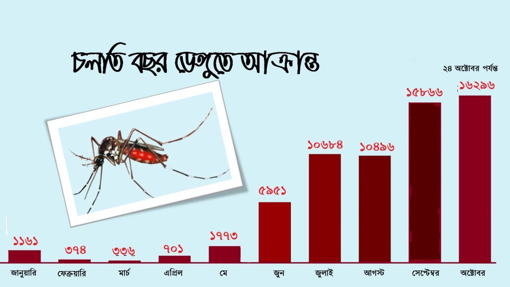 অক্টোবর পেরিয়ে গেলেই যেখানে ডেঙ্গু থেকে একটু স্বস্তির সম্ভাবনা মেলে এ বছর তাও গুঁড়েবালি। ক্যালেন্ডারের হিসাবে ডেঙ্গুর মৌসুম শেষ হলেও বাস্তবতা বলছে, দিন দিন বাড়ছে এর ভয়াবহতা। যার বিস্তার ছড়িয়েছে দেশের ৬৩টি জেলায়।